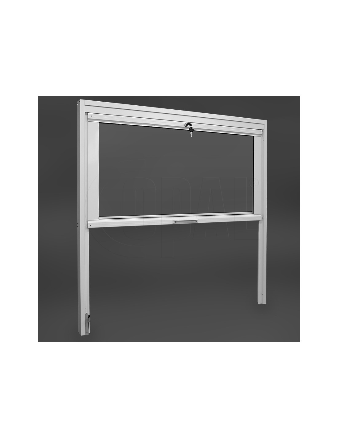 Na prowadnicach zamontowane są blokady, których funkcją jest ochrona przed niekontrolowanym opadnięciem skrzydła ruchomego. Konstrukcja ma także zamek bagnetowy, który umiejscowiony jest po stronie wewnętrznej. Z tego też powodu nie jest on widoczny dla osoby, znajdującej się na zewnątrz okna. Jeśli zdecydujesz się na opcję bez siłownika – ciężar części podnoszonej będzie wynosić do 7 kg. W oknie zastosowano profil aluminiowy. Należy także wspomnieć o tym, że oferowane okno podawcze jest bez parapetu. Nie ma również dolnego profilu ramy.
